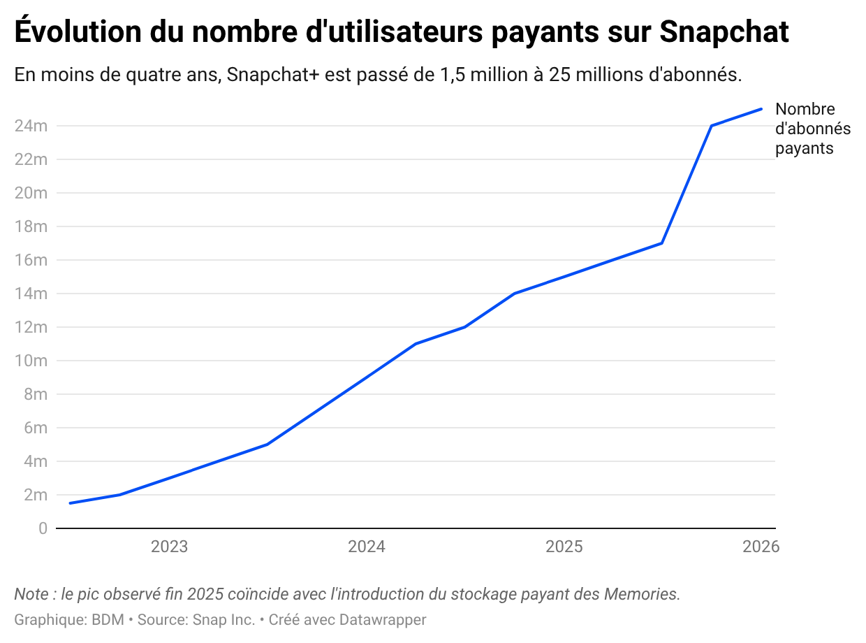 La dynamique est d’autant plus frappante quand on la replace dans le temps. En effet, fin 2024, Snapchat comptait 14 millions d’abonnés payants, mais un an plus tard, la plateforme en revendique 25 millions, soit presque le double en l’espace de 12 mois ! À noter toutefois que le passage du stockage des Memories en offre payante a contribué à booster ce chiffre.