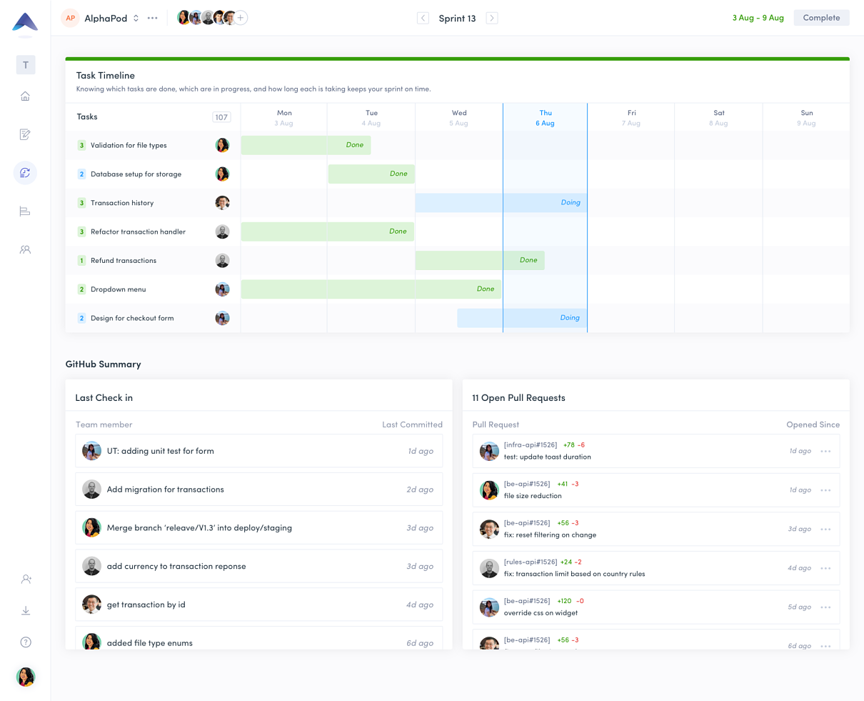 La page d’accueil de votre espace de travail rapatriera de nombreuses informations statistiques sur l’avancée du sprint global, de vos propres tâches, mais aussi les pull requests qui vous concernent (si vous avez lié votre compte GitHub). Une bonne manière d’avoir une vue d’ensemble sur l’avancée de votre projet, et de vous guider dans vos tâches.