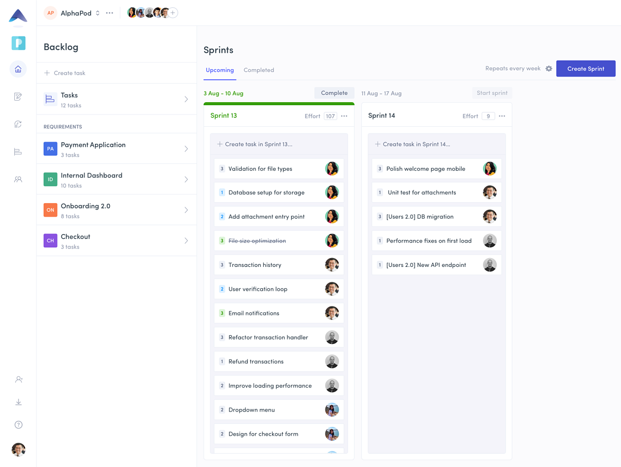 La simplicité de l’outil saute aux yeux quand on s’inscrit. L’utilisation est intuitive, vous serez prêts en quelques minutes à commencer un sprint. La création de nouvelles tâches se fait en un clic, vous pourrez ensuite les regrouper dans des dossiers « Requirements », leur attribuer un temps de réalisation, un statut, leur attribuer un collaborateur, les diviser en sous-tâches ou encore les commenter. Mieux encore, vous pouvez la lier à votre compte Github pour rapatrier des branches, des pull requests et des commits. Passez simplement les tâches de votre backlog aux colonnes dédiées pour remplir votre sprint avant de le lancer.