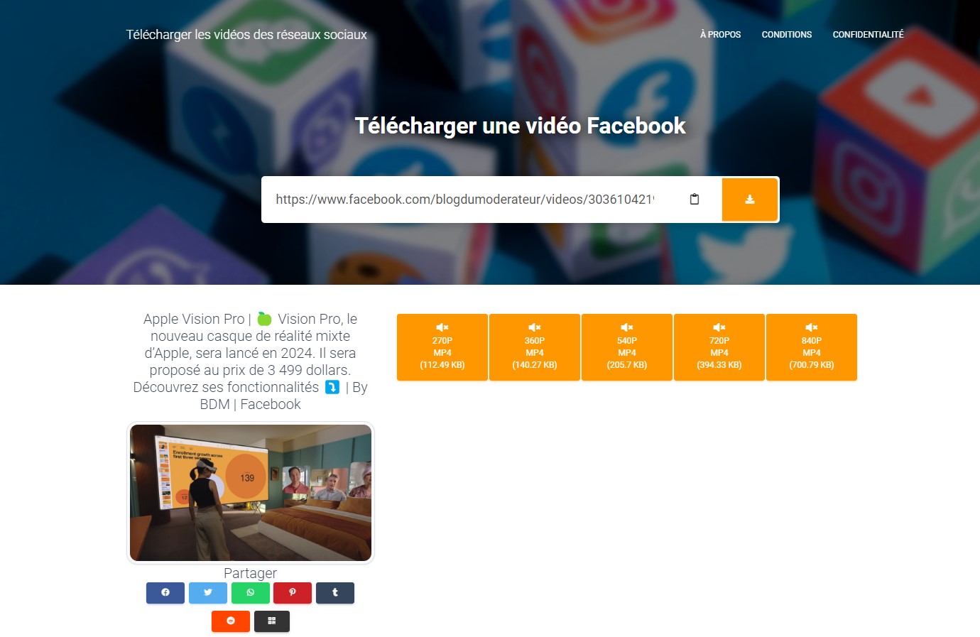 FBDownloader télécharge vos vidéos issues de Facebook. Après avoir entré votre lien, il vous suffit de choisir la taille de l’image souhaitée. Pour les fichiers lourds, le téléchargement sera un peu plus long, car la plateforme devra charger séparément le son et la vidéo, avant de les lier à nouveau.