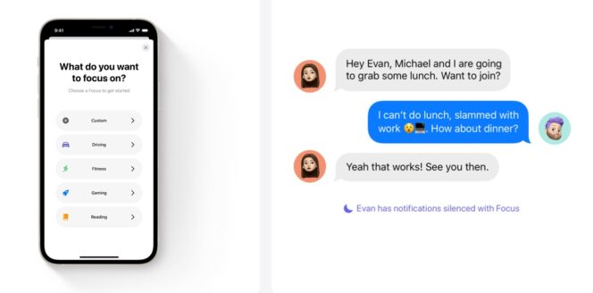 Le mode Focus est conçu pour aider à la concentration et filtrer les notifications, en signalant les moments d’indisponibilité. Vous êtes libre de choisir le niveau de focus que vous souhaitez en l’adaptant à vos besoins. L’application propose plusieurs modes prédéfinis pour certaines activités telles que la conduite, le sport, la lecture ou encore les jeux-vidéos. Il est possible de créer votre propre mode de Focus.