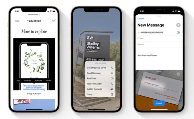 L’une des principales nouveautés d’iOS 15 est la lecture automatique du texte dans les photos. Elle permet de copier-coller des textes pris en photos, mais également de passer un appel ou d’envoyer un email en cliquant sur le texte mis en évidence. Vous pouvez utiliser cette fonctionnalité sur une photo existante, mais également depuis l’appareil photo. Un outil de traduction automatique est intégré, et permet de traduire le texte détecté dans 7 langues différentes : l’anglais, le chinois, le français, l’italien, l’allemand, le portugais et l’espagnol.