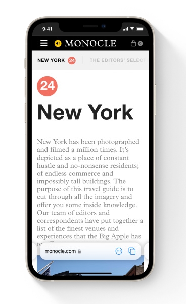 Le navigateur web d’iOS dispose d’une nouvelle barre d’onglets, pour gagner de la place sur l’écran et devenir presque invisible lorsque vous scrollez une page. L’affichage des groupes d’onglets change également, et peut se synchroniser sur tous vos appareils.