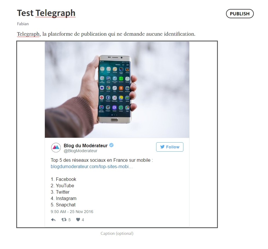Une fois sur le site, vous êtes face à une feuille blanche. Vous pouvez indiquer un nom d’auteur, mais rien ne vous y oblige. Contrairement à Medium ou d’autres plateformes, il n’y a pas de page d’accueil avec une sélection d’articles. Telegraph créé une URL avec votre titre afin de partager l’article, mais c’est la seule façon d’y accéder. Les possibilités de mise en page sont minimalistes, il est uniquement possible de mettre du texte en gras, en italique, d’agrandir la police et d’intégrer un lien ou une citation. Telegraph permet par contre d’intégrer des contenus médias (tweets, vidéo YouTube…) par un simple copier coller de l’URL. On peut aussi intégrer des photos en 1 clic. L’expérience est vraiment surprenante. On peut publier une tribune ou un article en quelques secondes. Notons qu’il n’y a aucune publicité et qu’il n’y a aucune distraction… si ce n’est une page blanche. Ce qui est assez rare sur le web !