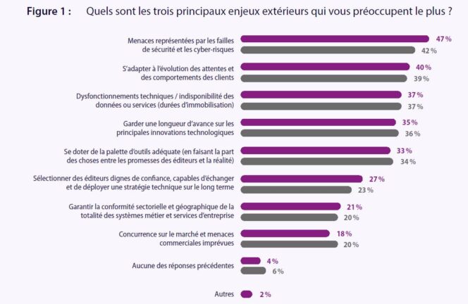 Les données jouent un rôle de plus en plus important pour les entreprises comme pour les consommateurs, et sont de plus en plus nombreuses. Elles sont indispensables pour proposer une expérience client personnalisée, mais tout doute sur leur sécurité et sur leur bonne utilisation peut nuire à la réputation d’une entreprise. Il n’est donc pas étonnant de retrouver ces deux préoccupations en tête des enjeux extérieurs qui préoccupent le plus les professionnels de l’IT, devant les éventuels dysfonctionnements techniques, eux aussi très proches de l’expérience client. Le fait de garder une longueur d’avance sur les innovations technologiques n’arrive qu’en quatrième position.