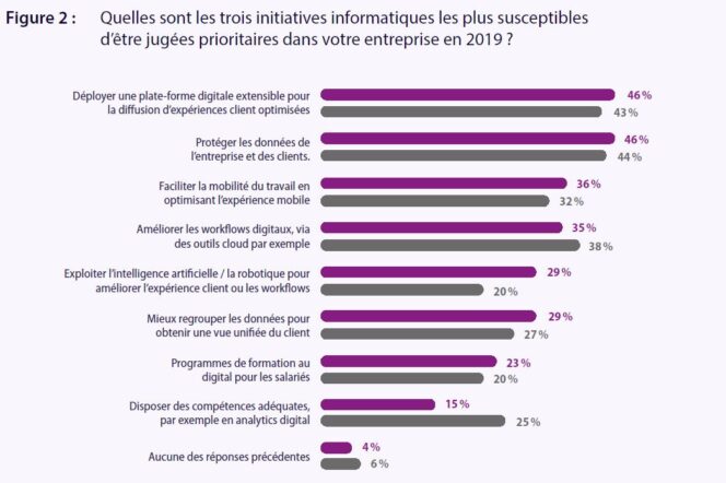 Ces deux thèmes reviennent logiquement dans les initiatives informatiques les plus susceptibles d’être jugées prioritaires. En tête, on retrouve le fait de déployer une plateforme digitale extensible pour la diffusion d’expériences clients optimisées, devant la protection des données de l’entreprise et des clients. Les deux chiffres sont en hausse par rapport à 2018. L’optimisation de l’expérience mobile pour faciliter la mobilité du travail arrive ensuite, de même que l’amélioration des workflows digitaux, notamment avec les outils cloud.