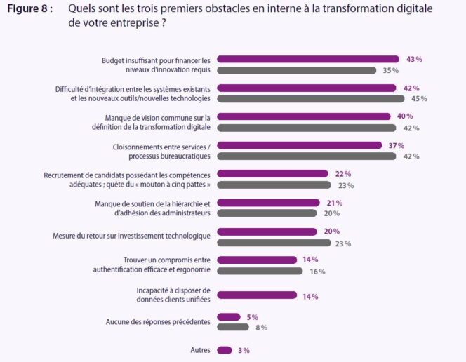En ce qui concerne les obstacles rencontrés face à la transformation digitale, le budget prend cette année la première place, devant la difficulté d’intégration entre les nouveaux outils et les systèmes existants, qui recule à la deuxième place. Le manque de vision commune est troisième, le cloisonnement entre services quatrième.
