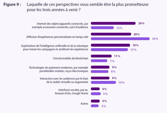 Enfin, l’étude s’est intéressée aux perspectives les plus prometteuses pour les trois années à venir. L’internet des objets arrive largement en tête pour les professionnels de l’IT, alors que les autres fonctions de l’entreprise consacrent la diffusion d’expériences personnalisées en temps réel. L’exploitation de l’intelligence artificielle et de la robotique pour mener les campagnes et améliorer les expériences complète le podium.