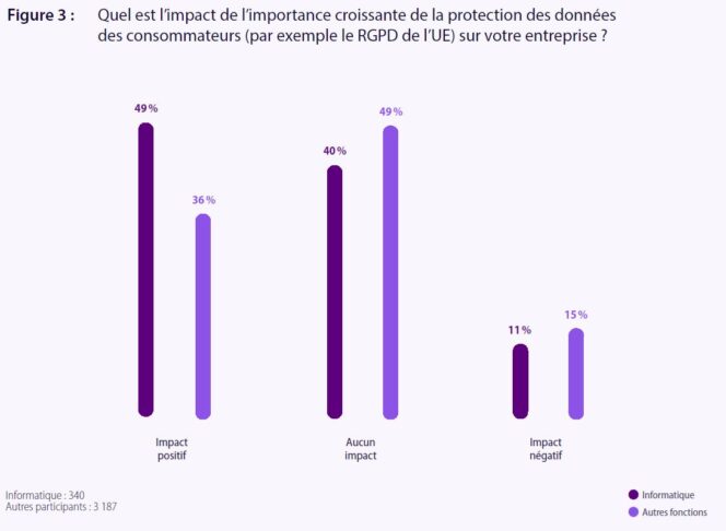 Si ce sujet de la sécurité des données continue de prendre de l’importance dans le travail et les considérations des professionnels de l’IT, l’impact de cette prise en compte croissante de la protection des données sur les entreprises, notamment liée au RGPD, est considérée dans la majorité des cas comme positive (49%), plus que dans les autres services (36%).