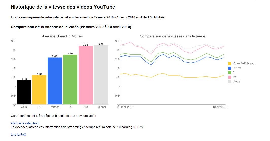 Parfois, les vidéos sur Youtube mettent un temps infini à se charger… Et on ne sait pas si le problème vient de sa propre connexion ou d’éventuels soucis du côté de la plateforme de partage de vidéos. Pour répondre à cette question et donner un état des lieux de notre vitesse de connexion, Youtube a mis en place il y a quelques mois un petit service très bien fait qui permet de comparer ses caractéristiques par rapport à d’autres indicateurs. Pas vraiment nouveau mais j’étais passé à côté lors de sa sortie, comme d’autres je pense.