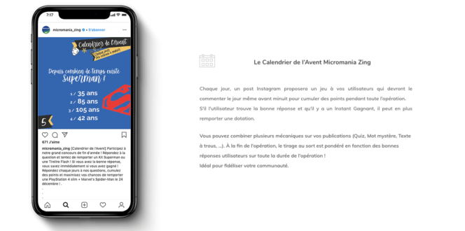 Par exemple, Timelime propose un Calendrier de l’avent. Idéal pour les fêtes de fin d’année, ce jeu peut nous permettre de faire participer notre communauté tous les jours afin de cumuler des points. Timelime s’occupe de faire le cumul des participations en fonction des bonnes ou mauvaises réponses sur toutes les publications de jeu, et en fonction du timing de publication (une réponse sur une publication du 3 décembre faite le 5 décembre ne sera pas prise en compte). Les gagnants seront connus à la fin de la période. Idéal pour fidéliser ! Micromania, par exemple, a déjà utilisé ce format.