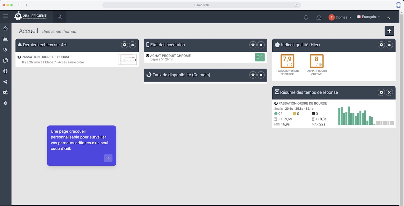 Contrairement à la majorité des outils de monitoring, qui se concentrent sur les performances techniques et la disponibilité des infrastructures, 2Be-FFICIENT permet de configurer des tests automatisés qui simulent le parcours utilisateur, afin de détecter les lenteurs, les blocages ou les erreurs avant qu’ils n’affectent les clients finaux.