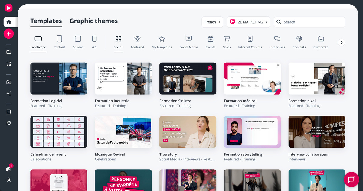 - Via des Templates premium : accédez à une bibliothèque de modèles métiers créés par des professionnels du motion design et personnalisez-les en quelques clics.