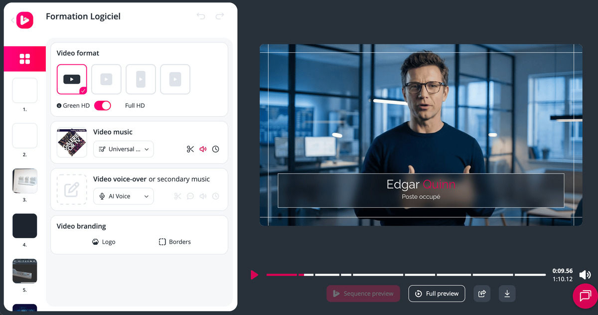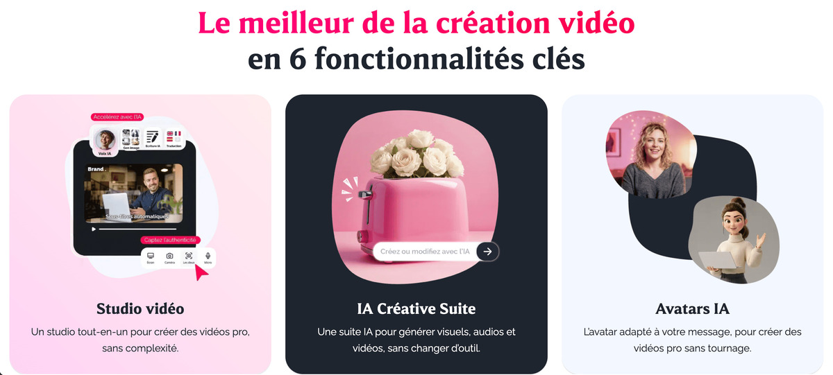 - Fonctionnalités pratiques : coupez, recadrez et convertissez vos vidéos en MP4, GIF ou format SCORM, et utilisez le player interactif pour rendre vos contenus cliquables.