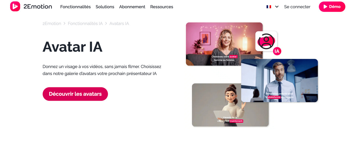 - Via les Avatars IA : choisissez votre ambassadeur virtuel, sa mise en scène et sa voix pour produire des vidéos sans aucune contrainte de tournage.