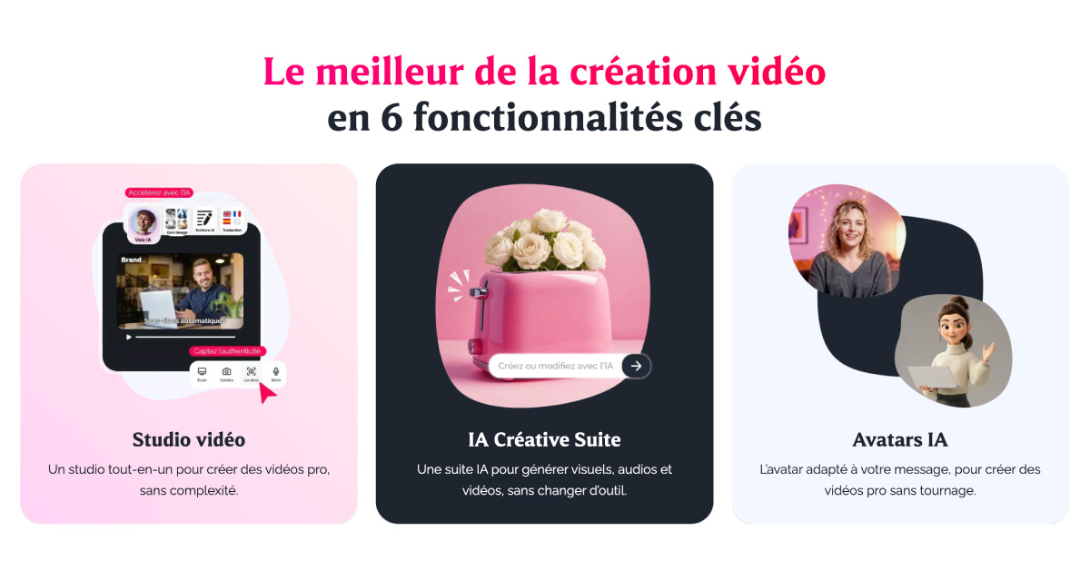 - Et bien plus encore : coupez, recadrez et convertissez vos vidéos en MP4, GIF ou format SCORM, et utilisez le player interactif pour rendre vos contenus cliquables.