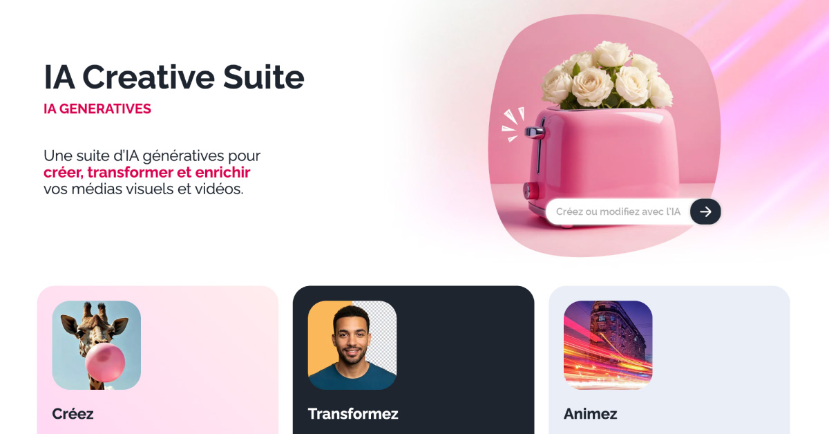 - Génération de contenus : photos, visuels, vidéos et audios créés à partir de vos idées.