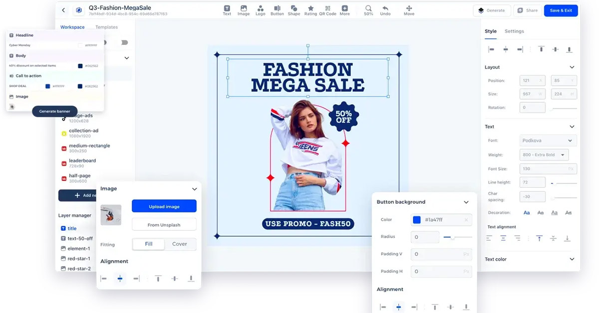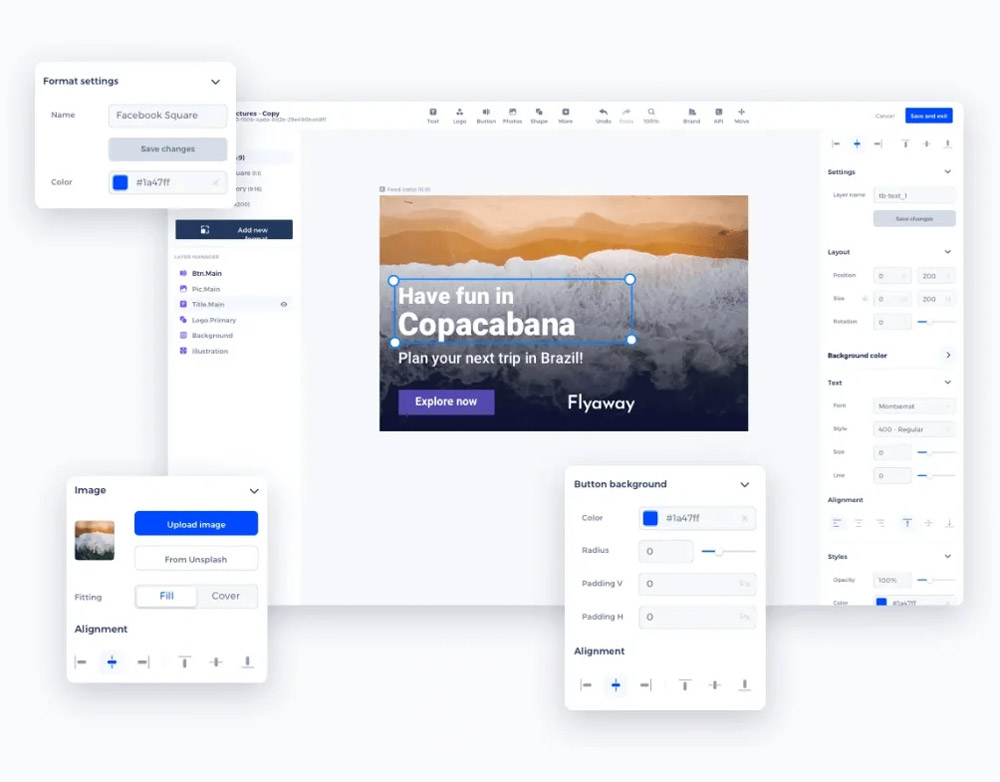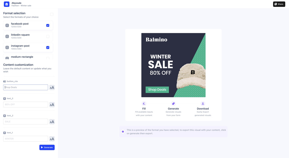 Abyssale permet la création de campagnes multiformats, tout en synchronisant les modifications sur les calques. La création d’un seul template est nécessaire. Il sera ensuite automatiquement adapté aux différents formats. Chaque visuel peut être modifié indépendamment des autres.