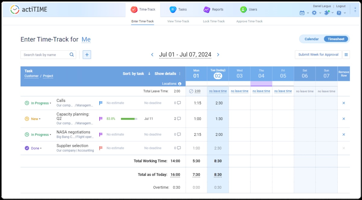 Outre le suivi du temps, actiTIME est un outil parfaitement conçu pour la gestion de projet. Il offre la possibilité d’assigner des tâches à chaque membre de votre équipe, d’en estimer le temps pour répartir équitablement la charge de travail et de créer des statuts pour chaque mission (en cours, en attente, terminé, etc.). Chaque mission peut, en outre, être priorisée en fonction de son importance.