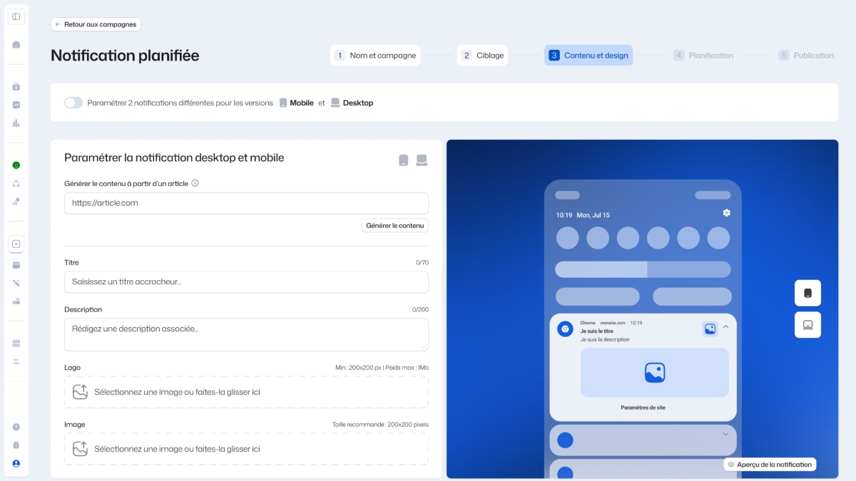 Ces messages peuvent être utilisés pour diffuser des contenus éditoriaux, relayer des offres promotionnelles, annoncer des nouveautés ou inciter au retour sur le site. La plateforme supporte également les campagnes automatisées : welcome push, relance d’abandons de panier, remerciement post-achat, sollicitation d’avis client, etc. La solution fonctionne sur la plupart des navigateurs (Chrome, Edge, Firefox, Opera, Safari) et sur Android, et ne requiert aucune collecte de données personnelles des internautes, qui peuvent désactiver les notifications à tout moment.