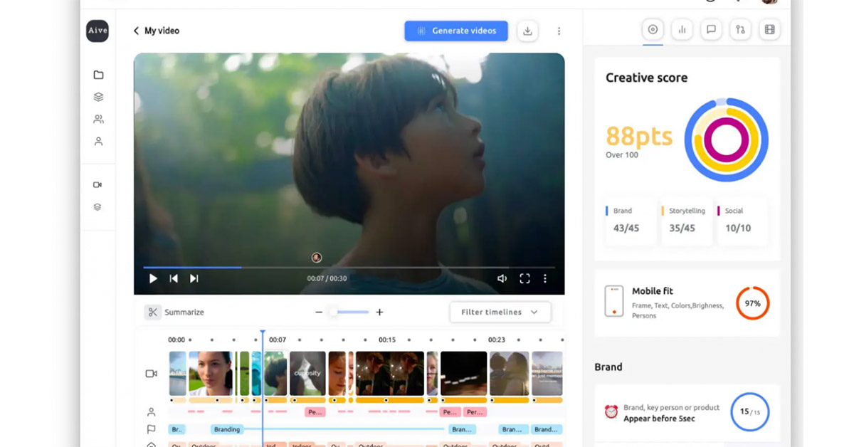 - Score de performance créative : l’intelligence artificielle intégrée à la solution donne accès à un score créatif pour évaluer la performance de votre vidéo grâce à des indicateurs clés comme l’adaptabilité pour les réseaux sociaux, l’optimisation du branding ou la qualité du storytelling.