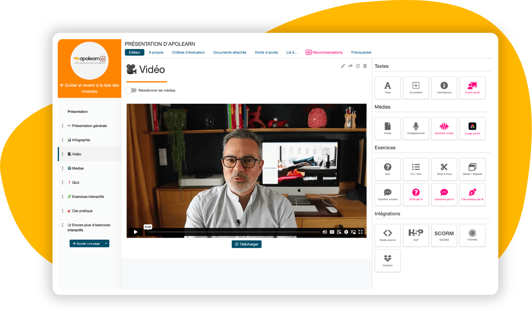 - Assistance IA pédagogique : l’IA intégrée aide à générer des plans de cours, des quiz ou des cas pratiques, et peut contribuer à une meilleure accessibilité des contenus.