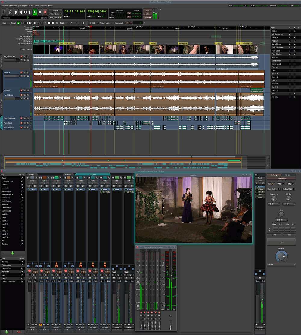 - Pistes : Ardour supporte un nombre illimité de pistes audio (mono, stéréo ou multicanaux) et gère les régions superposées, opaques et transparentes.