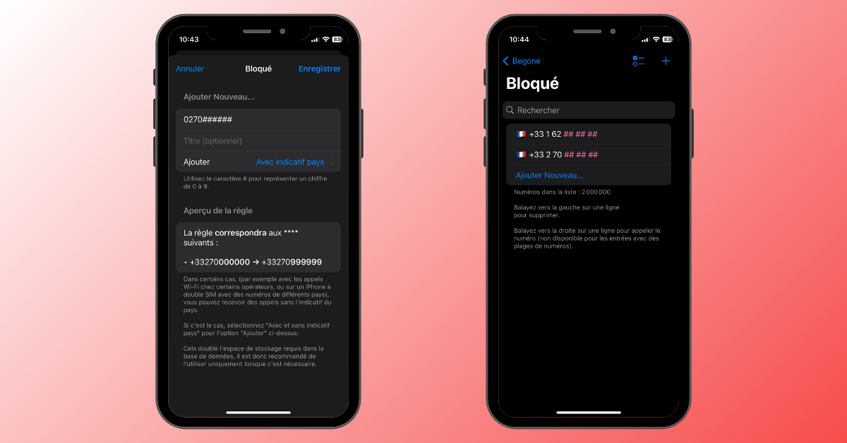 - Blocage des numéros : vous pouvez bloquer rapidement de nombreux numéros grâce à un mécanisme de caractère générique avec le symbole #. Par exemple, si vous saisissez le numéro 0162######, tous les numéros compris entre 01 62 00 00 00 et 01 62 99 99 99 seront assimilés comme spam.