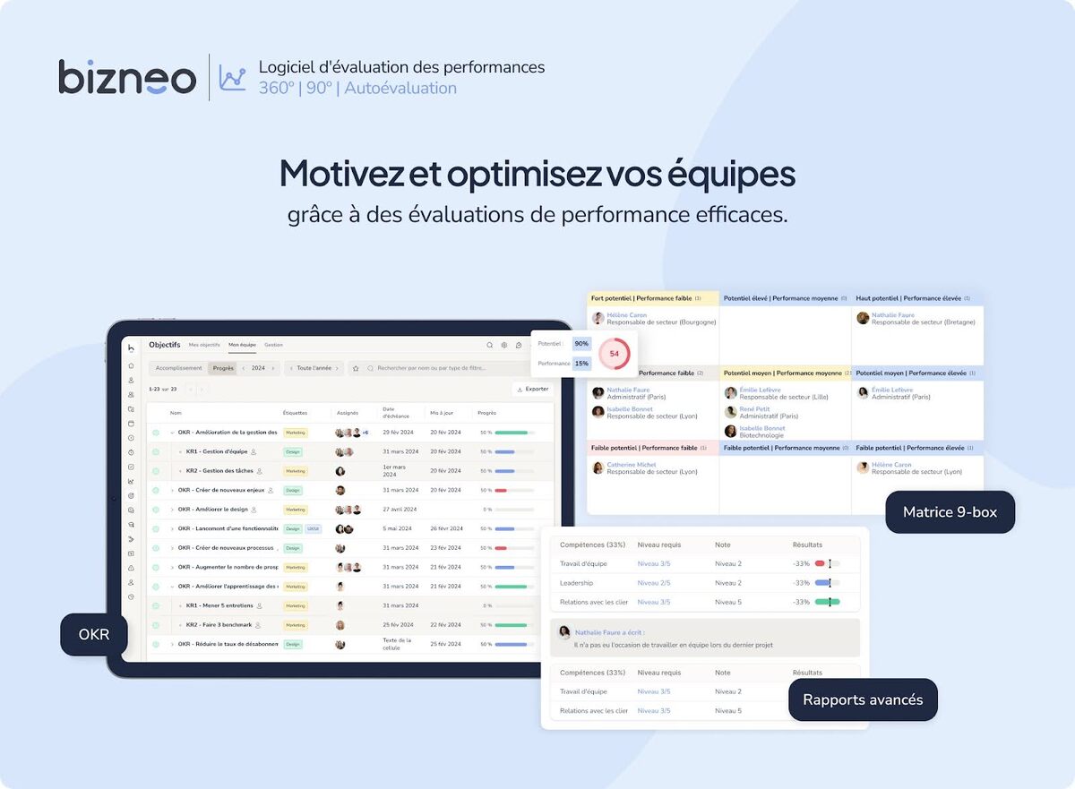 Au-delà des entretiens, Bizneo HR prend en charge la gestion des compétences, les plans de carrière, la formation, le suivi des objectifs (OKR) et l’analyse continue de la performance. Ces fonctionnalités offrent une vision globale et cohérente du développement individuel et collectif, tout en facilitant les prises de décisions stratégiques pour les équipes RH.