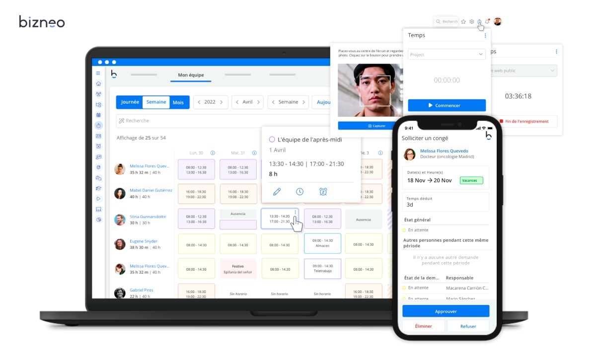Bizneo Time Manager vous permet de suivre les horaires des employés depuis : le site web, l’application mobile, une borne avec tablette ou un dispositif de reconnaissance biométrique. Des systèmes de pointage variés, comme la reconnaissance faciale, le QR code, le code PIN ou encore le chronomètre, vous permettent également de géolocaliser et de contrôler les présences.