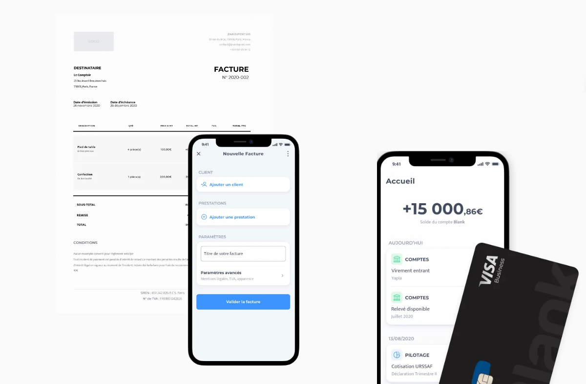 Blank est un compte bancaire professionnel en ligne qui s’adresse aux indépendants (artisans, commerçants, freelances, etc). Il s’agit d’une filiale du Crédit Agricole. Le service propose des outils administratifs et financiers pour simplifier la gestion de l’entreprise :