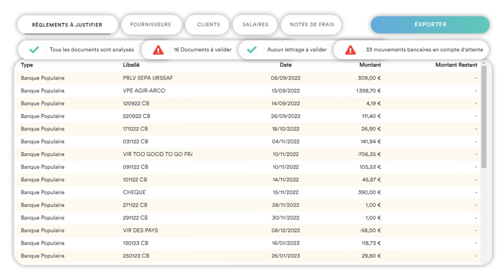 - Pilotage financier : en connectant votre banque, vous pouvez déposer vos pièces comptables en paramétrant des imports automatiques et journaliers de vos mouvements bancaires. Un tableau de bord personnalisable vous permet de voir en direct les indicateurs financiers de votre activité, les chiffres de votre entreprise, d’effectuer des comparatifs par jour, semaine, au mois et d’anticiper votre trésorerie.