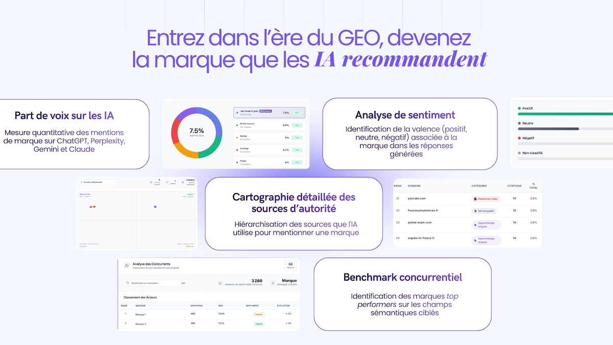 La solution produit aussi des benchmarks concurrentiels pour évaluer le positionnement d’une marque face à ses rivaux. Elle identifie quelles marques dominent sur les mêmes thématiques dans les résultats, tout en décryptant les tendances sectorielles qui émergent. Cette veille concurrentielle permet à chaque marque d’adapter sa stratégie selon les dynamiques du marché et d’enclencher des actions spécifiques pour renforcer sa visibilité.