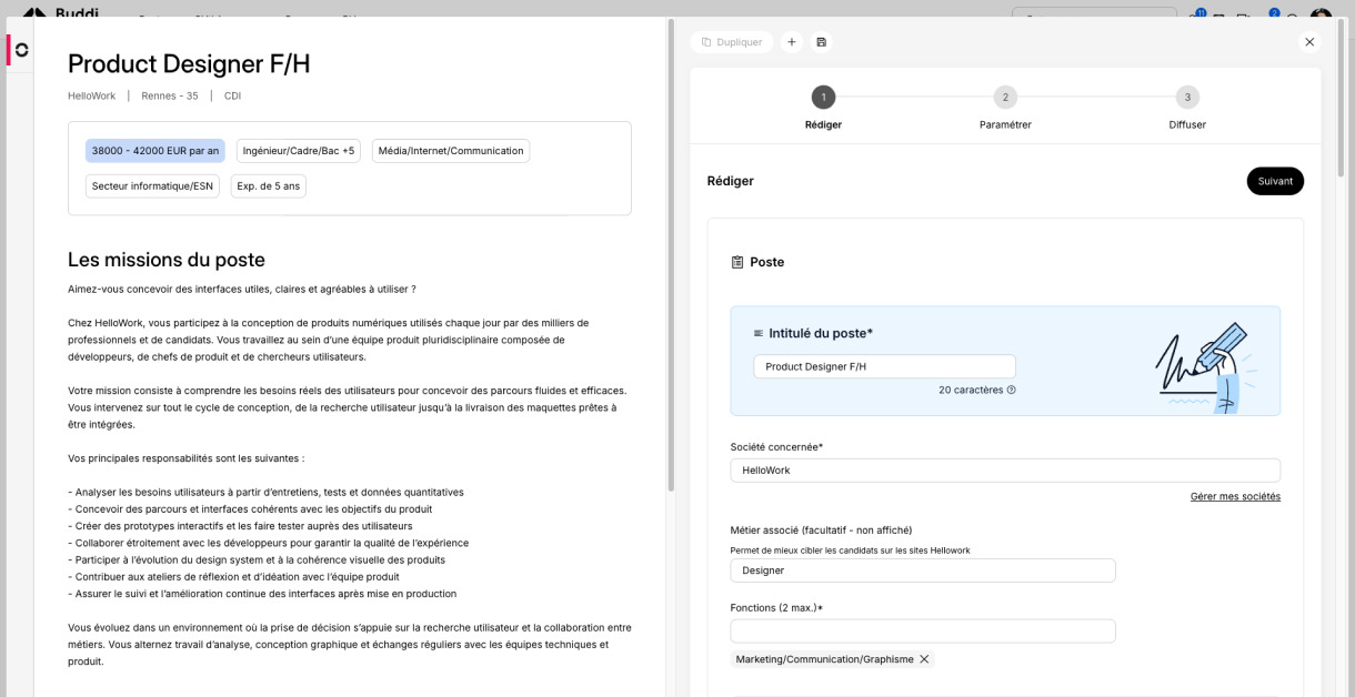 De plus, la recherche peut être assistée par l’IA : il suffit de décrire le profil recherché et Buddi identifie automatiquement les critères essentiels (métier, contrat, localisation, expérience, salaire, etc.) pour générer une recherche optimisée et vous proposer des résultats pertinents.