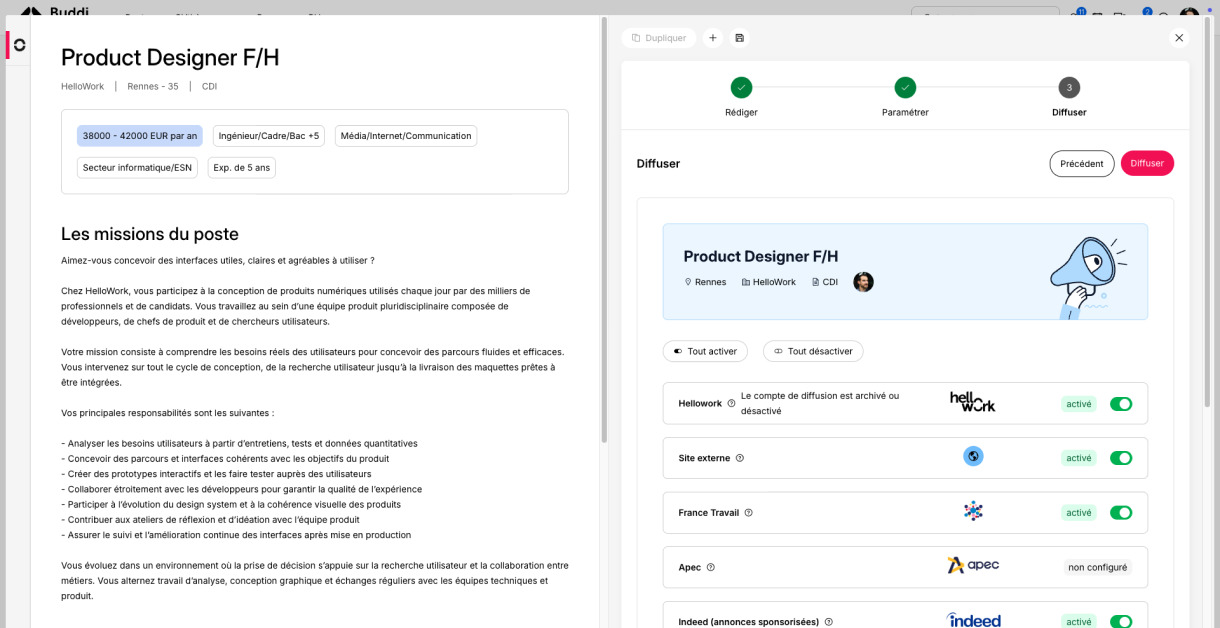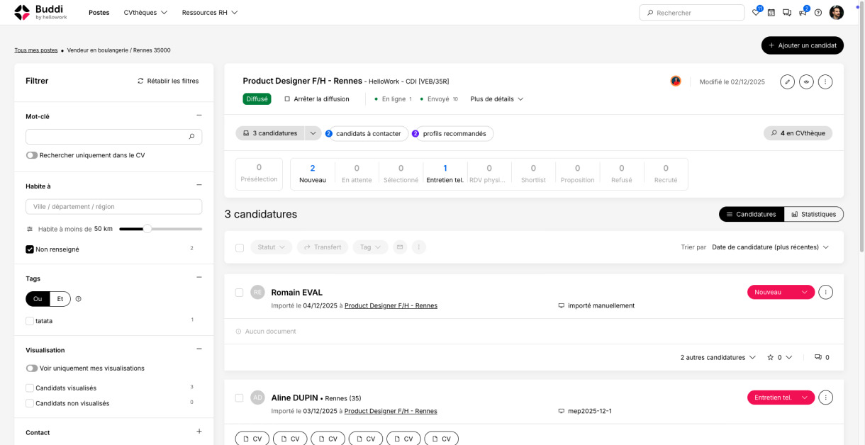 Buddi liste vos postes à pourvoir. Depuis le tableau de bord, vous visualisez vos offres d’emploi : l’intitulé du poste, le statut de diffusion et les candidatures. Vous avez ainsi une vision claire de vos annonces et des candidatures reçues. Vous avez la possibilité de consulter les CV rapidement et de les classer. Pour chaque offre d’emploi, l’outil recense les nouvelles candidatures, celles en attente, les candidats retenus en shortlist. Vous gérez les statuts de vos recrutements, de Nouveau à Recruté ou Refusé. De plus, vous avez la possibilité de créer de nouvelles offres d’emploi depuis la plateforme et les diffuser sur les sites d’emploi que vous souhaitez : Hellowork, Pôle emploi, APEC, etc.