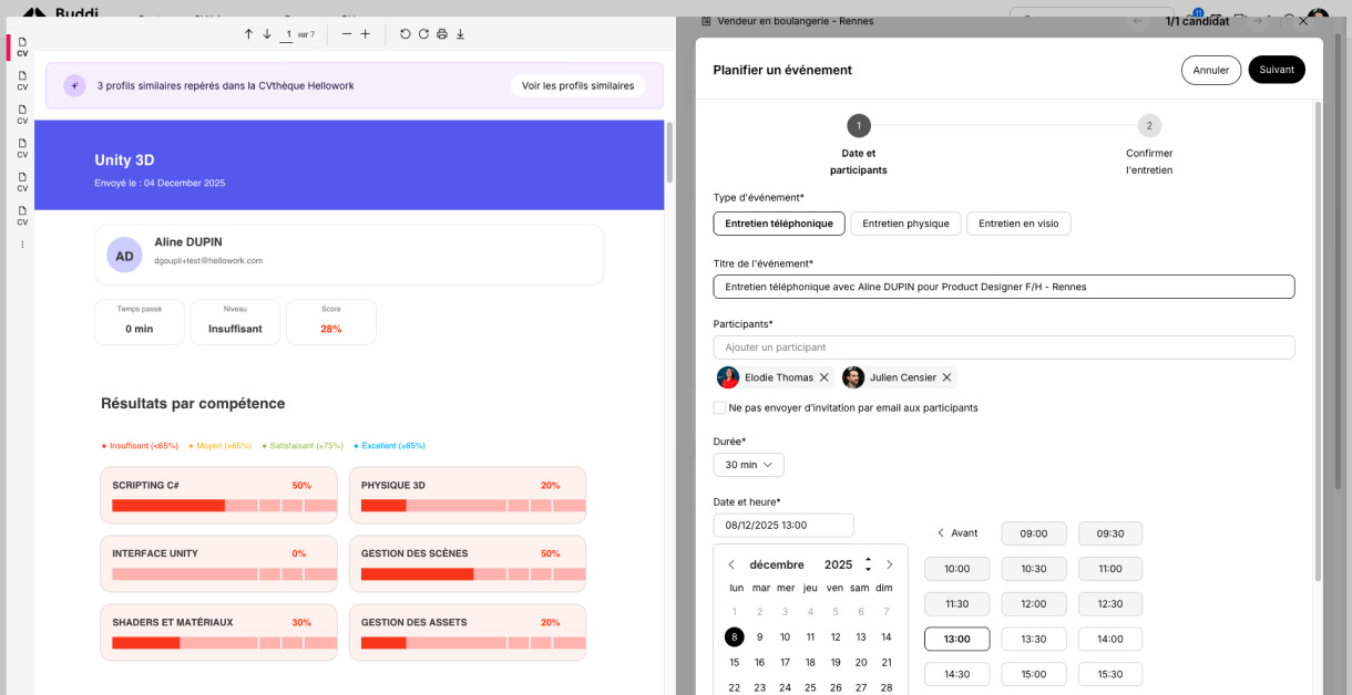 La plateforme vous permet de personnaliser vos entretiens ou tests par téléphone, en visio (sur Microsoft Teams notamment) ou de fixer des rendez-vous physiques. Ces différents moyens de rencontrer les candidats sont listés pour chaque candidature reçue. Pour faciliter les rencontres, Buddi synchronise vos agendas, affiche en temps réel les disponibilités de chacun, et vous permet de réserver automatiquement une salle de réunion. Vous recevez instantanément les réponses des participants, des salles et de vos candidats.