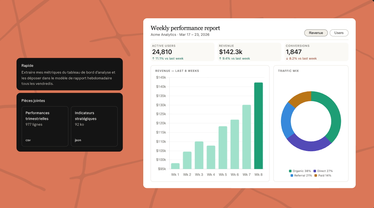 - Génération de livrables : Claude Cowork produit des documents finis, dont des feuilles de calcul mises en forme, des rapports, des présentations ou des notes de synthèse. Il peut combiner des modèles d’entreprise avec des documents sources pour respecter les conventions de mise en forme.