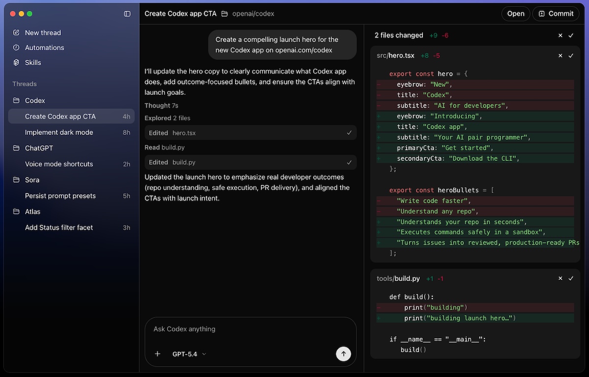- Génération et modification de code : Codex rédige des fonctionnalités, corrige des bugs et propose des modifications multi-fichiers, puis commit ses changements pour relecture.