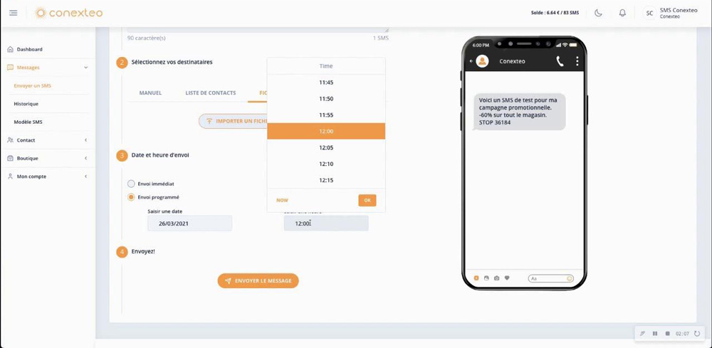 - SMS marketing : Conexteo permet d’envoyer des campagnes SMS marketing sans connaissance technique particulière. Il suffit de saisir le texte, de renseigner les numéros des destinataires et d’envoyer le message.