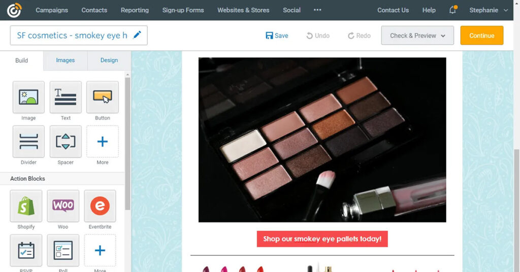 - Création et personnalisation d’emails : Constant Contact présente une centaine de modèles d’emails professionnels avec des lignes d’objets engageantes. L’IA vous assiste dans cette création personnalisée.