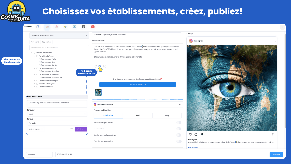 Cosmic Data permet de piloter efficacement la communication digitale de tous vos points de vente en adaptant des posts en local, tout en gardant une homogénéité et une vision globale, grâce à différentes fonctionnalités :