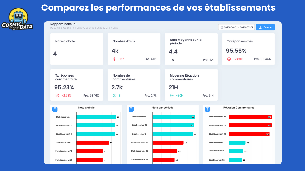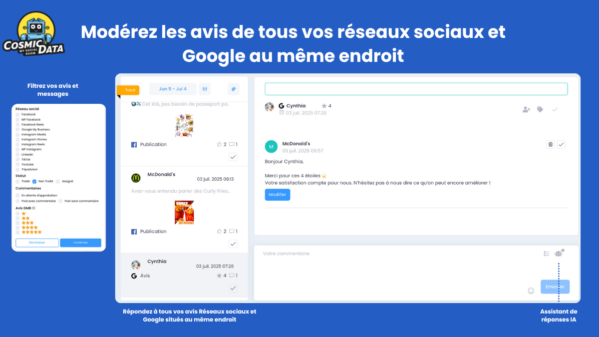 Cosmic Data est un logiciel de gestion des réseaux sociaux tout-en-un, spécialement conçu pour les enseignes, franchises et groupes multi-établissements. L’outil permet de centraliser la planification des publications, la modération des avis clients et la gestion des fiches Google, pour gagner en productivité, cohérence et visibilité locale. Vous pouvez également comparer les performances de vos fiches établissements et analyser votre audience et vos contenus.