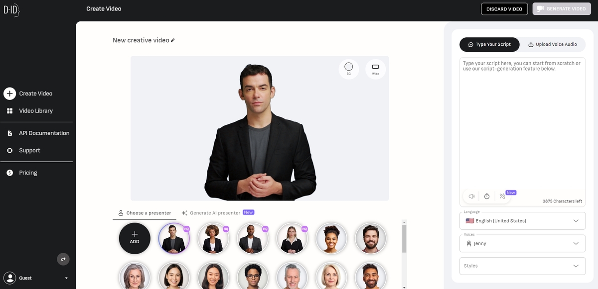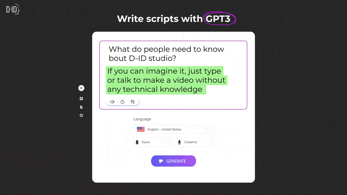 - Rédaction du script : un outil d’aide à la rédaction utilisant la technologie GPT-3 permet de générer le scénario pour votre vidéo.