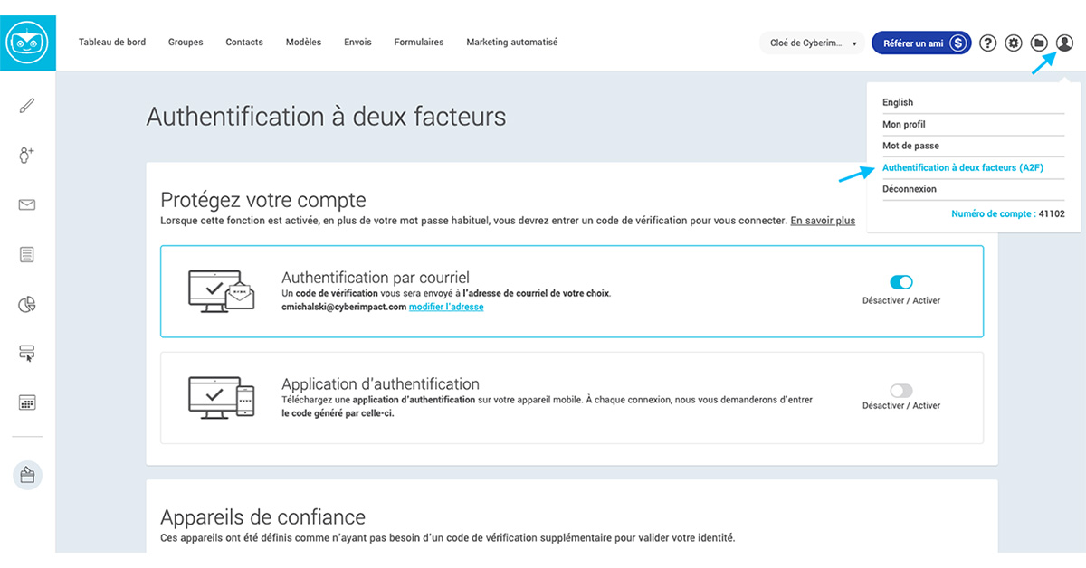 - 47,25 CAD/mois : fonctionnalités du forfait précédent, 40 champs personnalisés, vitesse d’envoi maximum, annulation des envois en cours, retrait du logo Cyberimpact.