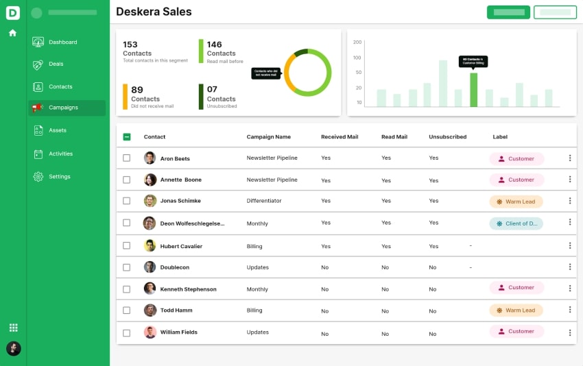 - gestion du service client : Deskera est doté d’un outil de relation client qui permet de gérer les transactions, les contacts, les pipelines, les activités, les ventes mais aussi la messagerie client. La plateforme dispose de fonctionnalités pour créer des campagnes d’emailing et des newsletters, mais également pour suivre les performances liées à ces campagnes. Vous pouvez également utiliser un système de ticketing pour gérer les requêtes des clients.