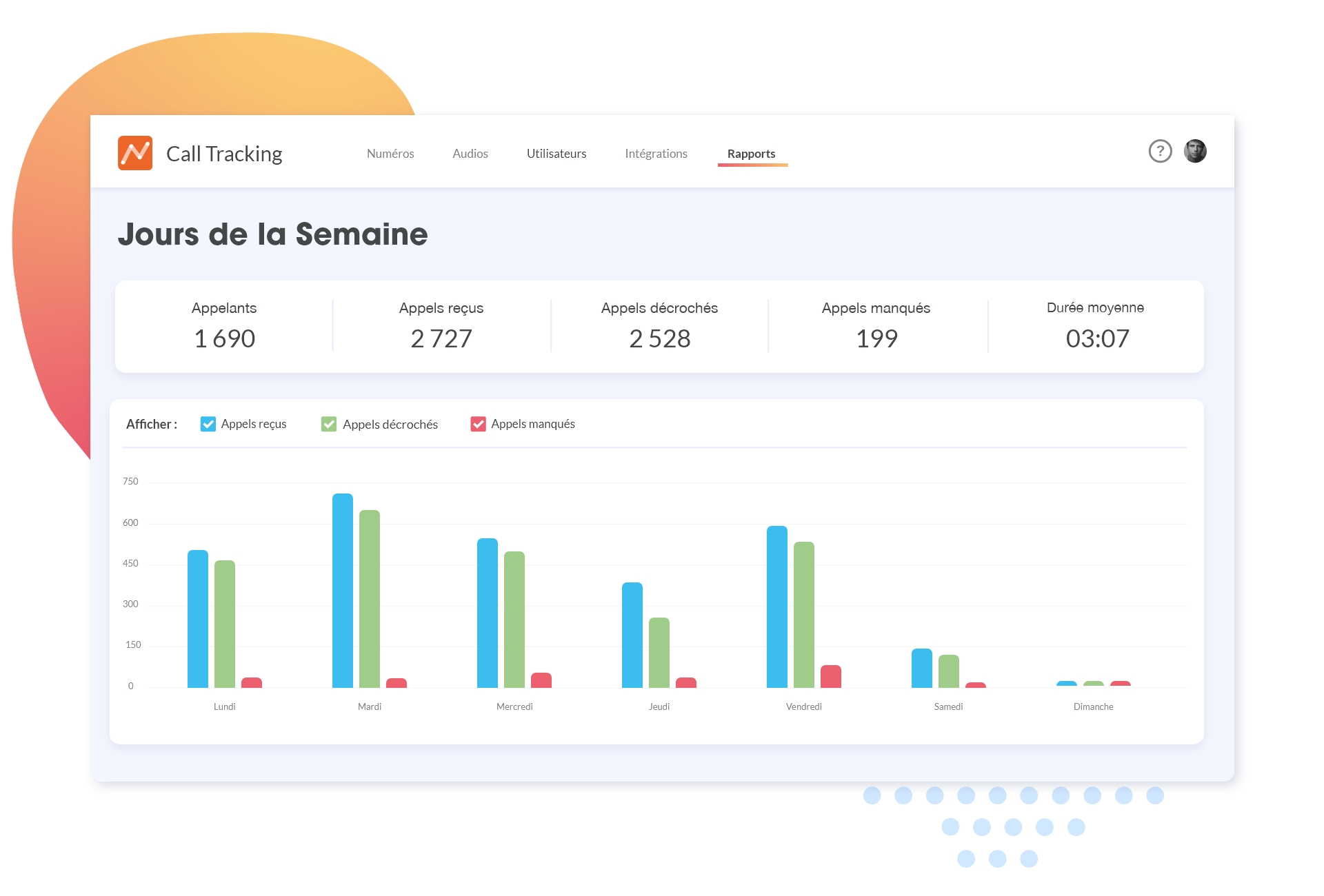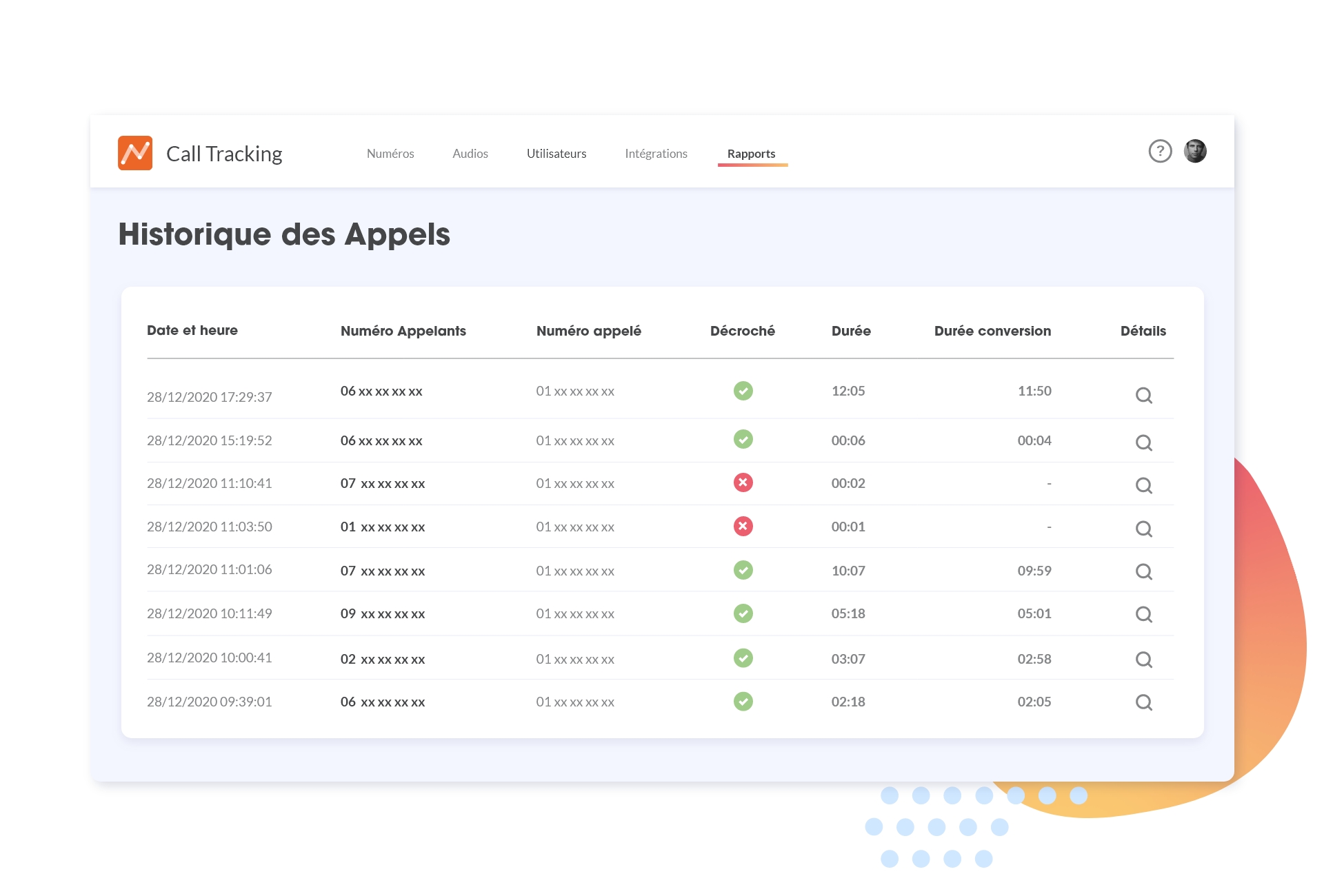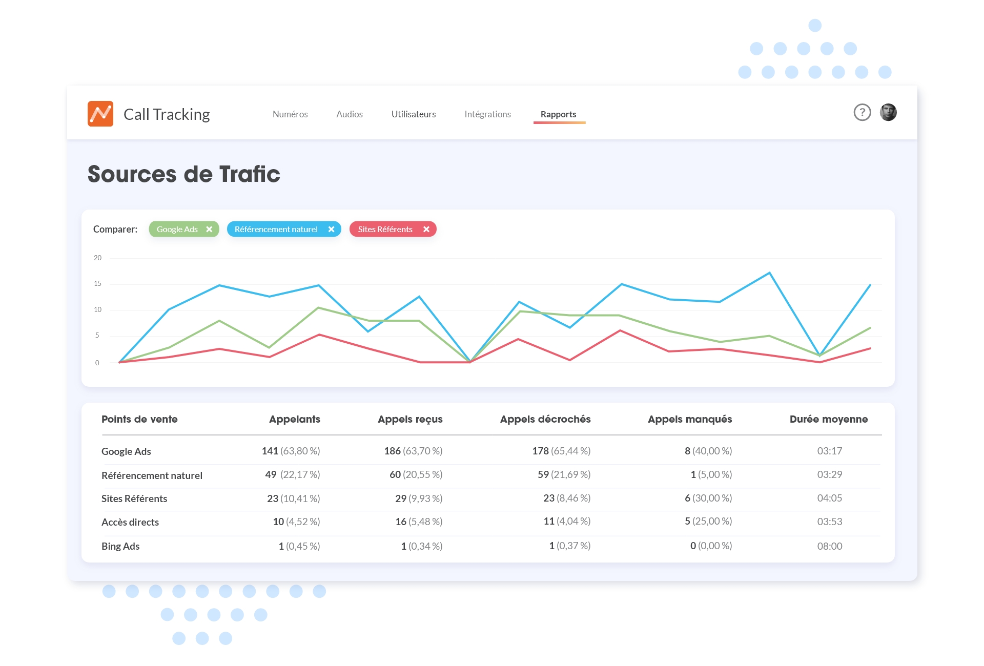 Grâce à la configuration de numéros de tracking, vous pouvez suivre les sources de conversions et recevoir des alertes par email lorsque les conditions sont remplies. Tous les reportings sont exportables en format Excel et CSV.