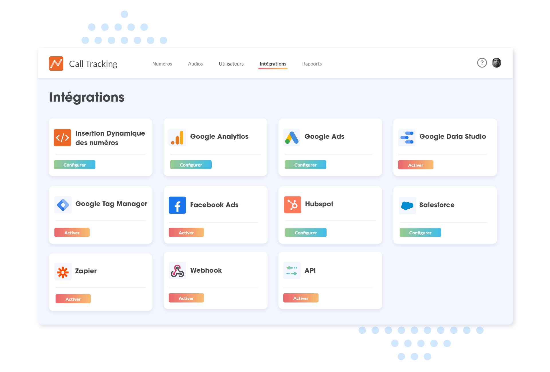 La solution Dexem Call Tracking s’intègre facilement à votre environnement global pour partager toutes les données sur vos appels, et ainsi approfondir l’analyse de vos performances marketing. Vous pouvez intégrer Dexem Call Tracking aux :