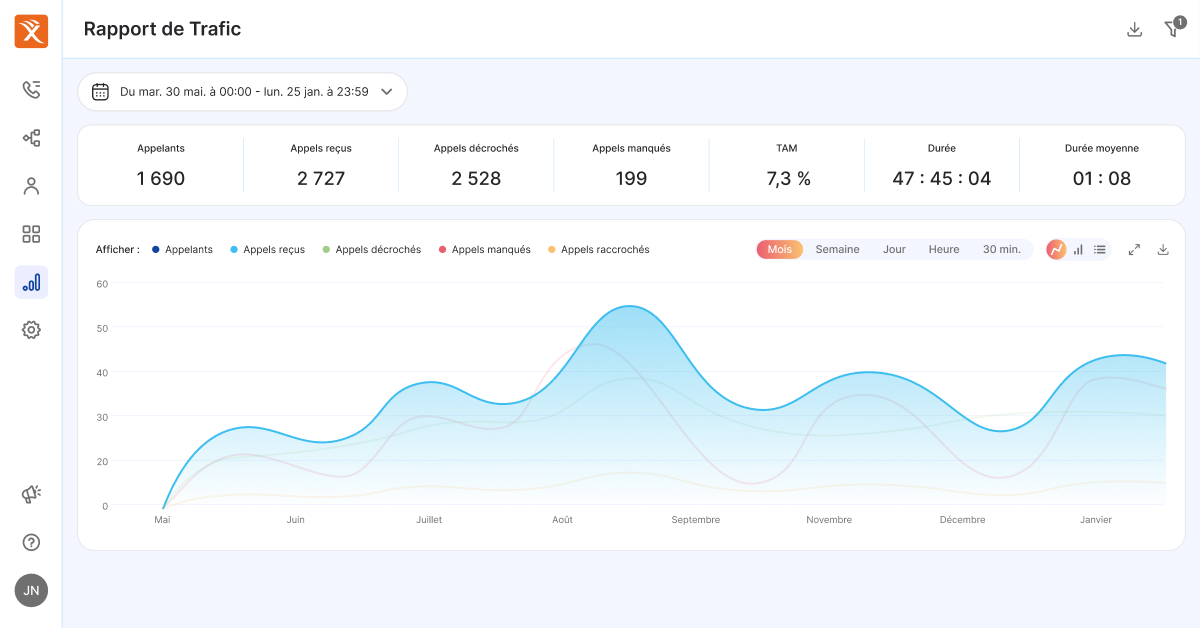 La plateforme propose des rapports détaillés et personnalisables, qui vous permettent d’accéder à des données précises sur vos appels entrants : nombre d’appels reçus, décrochés et manqués, durée des appels…