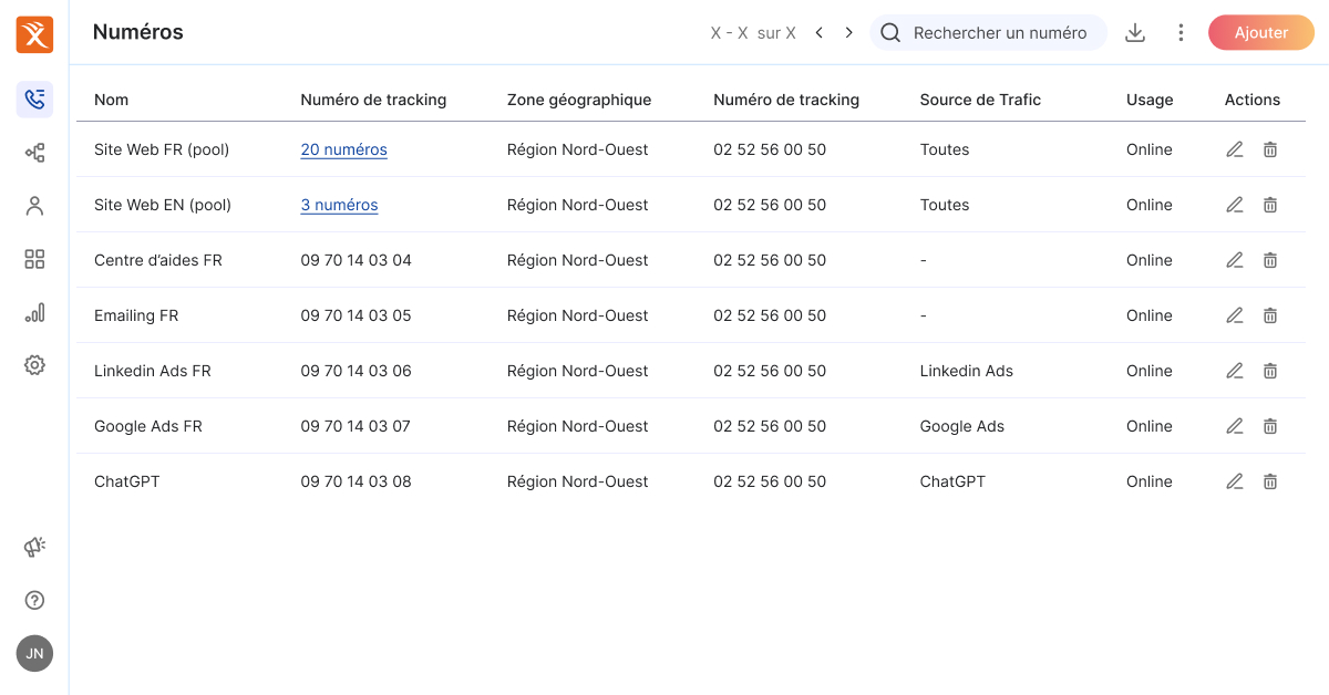 - Numéros de tracking dédiés : configurez des numéros (géographiques ou nationaux) pour les utiliser sur vos pages web et dans vos campagnes publicitaires.