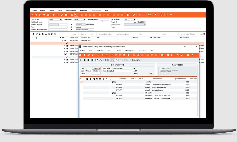 - Gestion commerciale : vous gérez l’intégralité du cycle de vie de vos produits et services. Vous avez une vision des stocks, des réapprovisionnements, vous gérez la base articles et services, les déclinaisons, les produits composés, les remises. Ce module permet la gestion des pièces commerciales et la gestion de la base de clients.